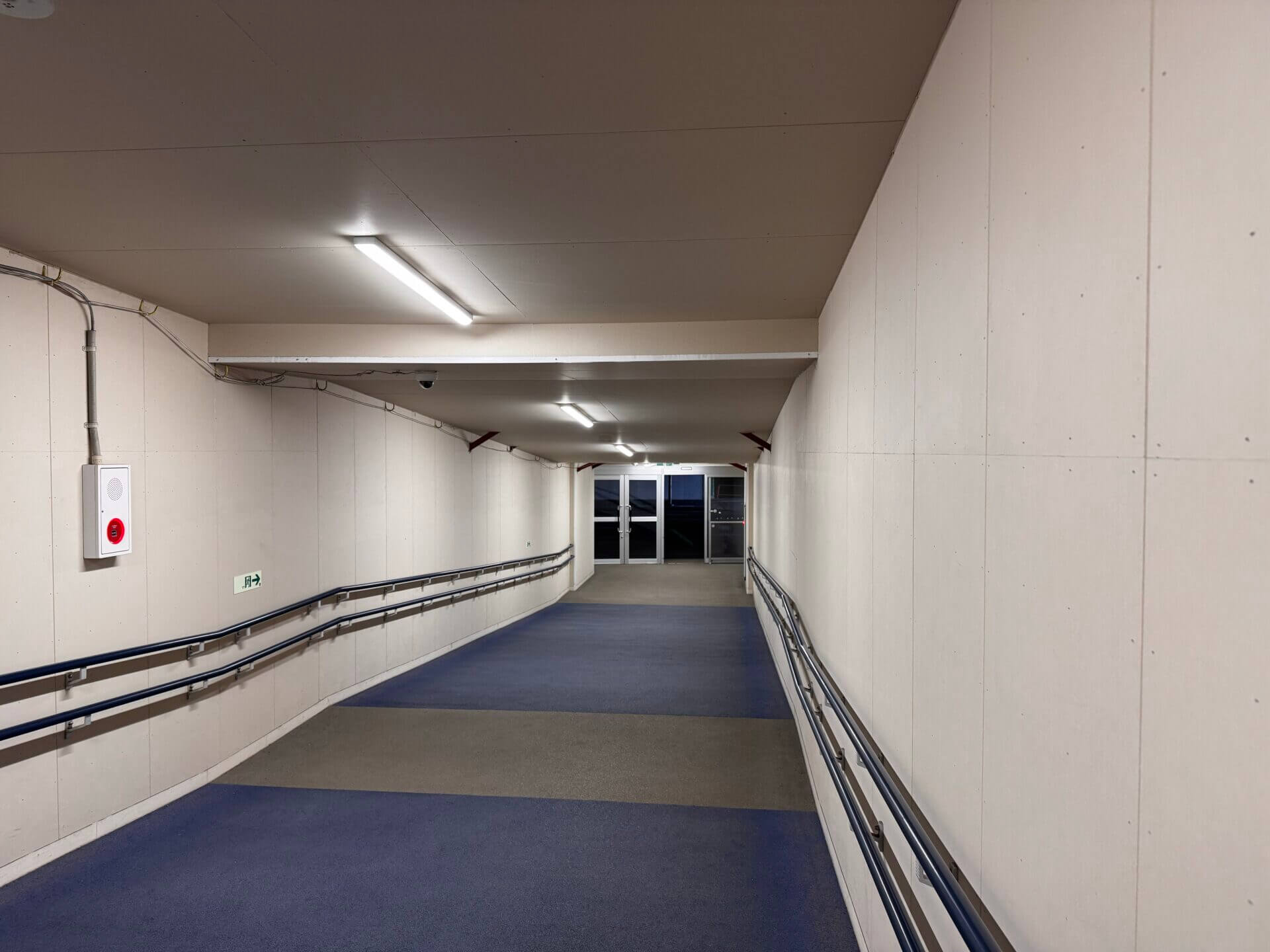 Cross the road and walk to the brown door with the large orange “WEST 6” above it under the overpass.